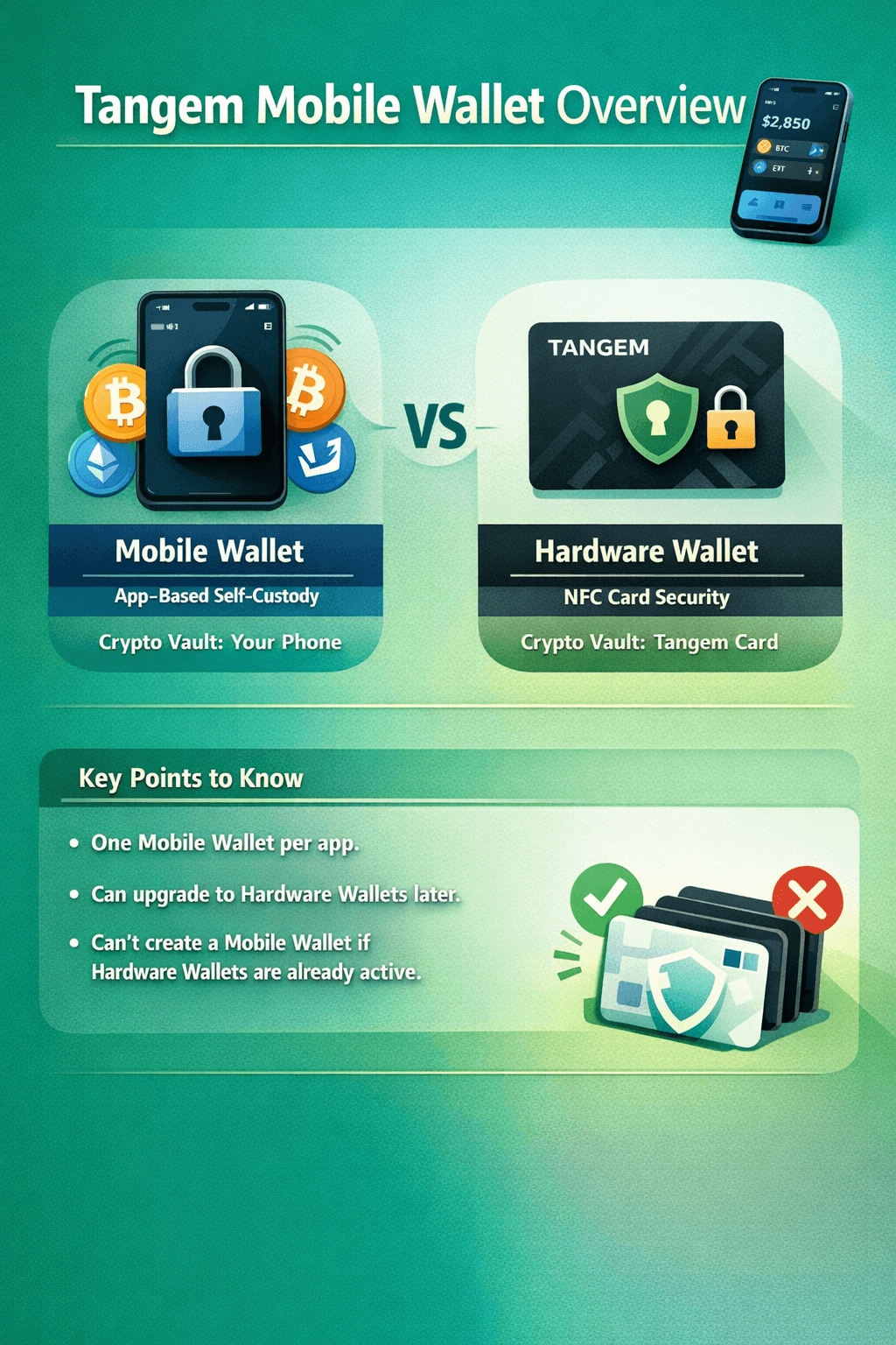 The Mobile Wallet is not the same thing as Tangem’s NFC card-based Hardware Wallet. With hardware, the “vault” is the card; with Mobile Wallet, the “vault” is your phone. In other words, it’s closer to a traditional software wallet experience, even though it lives inside the same Tangem app.