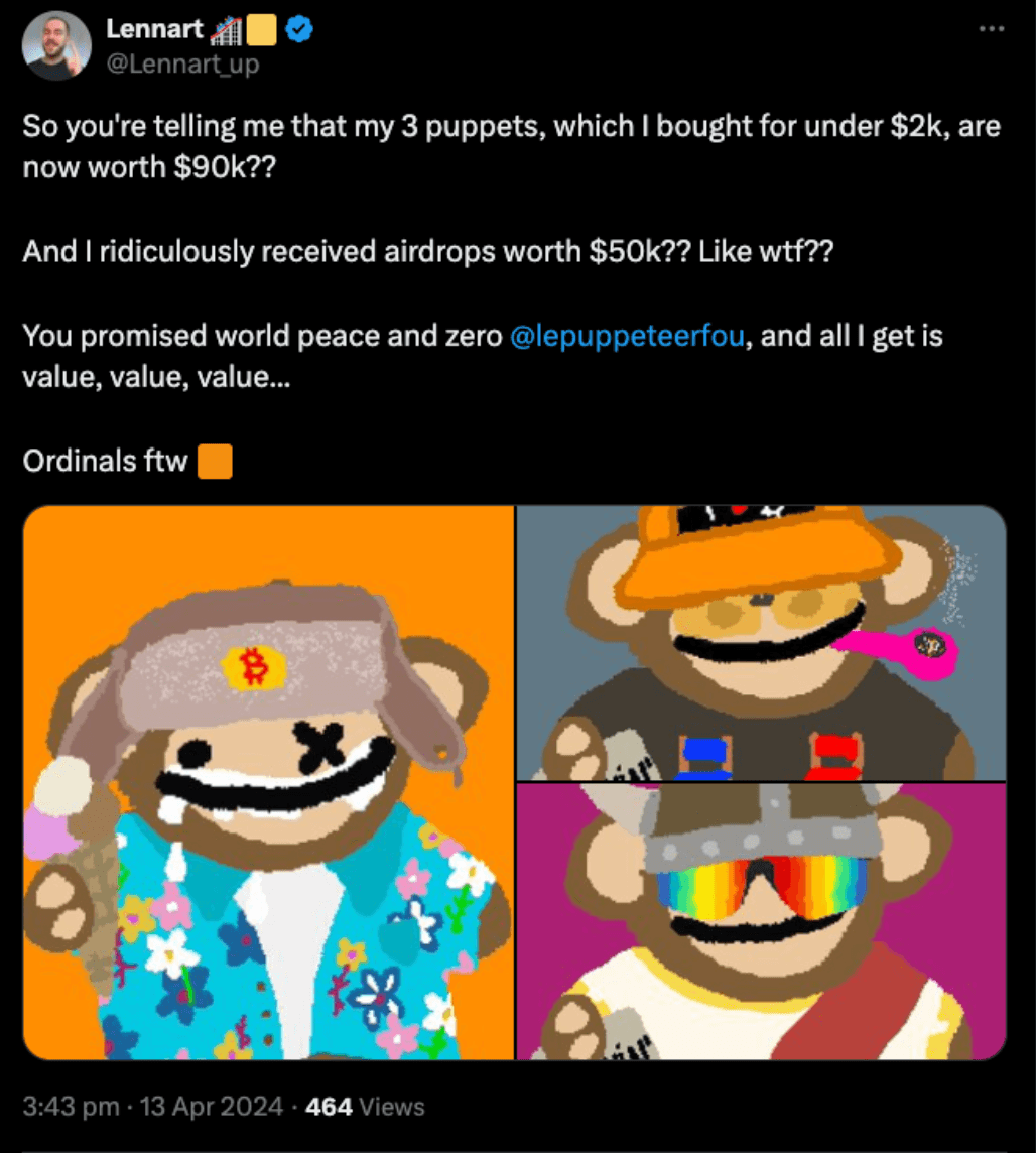 SourceSimply by holding and selling at the right times, Bitcoin Puppets minted numerous millionaires. When the market eventually catches up and reflects on this, it is likely that Ordinals will emerge as having been the ultimate alpha, surpassing most Ethereum NFT collections during the heyday of the 2021 bull run in terms of user rewards.