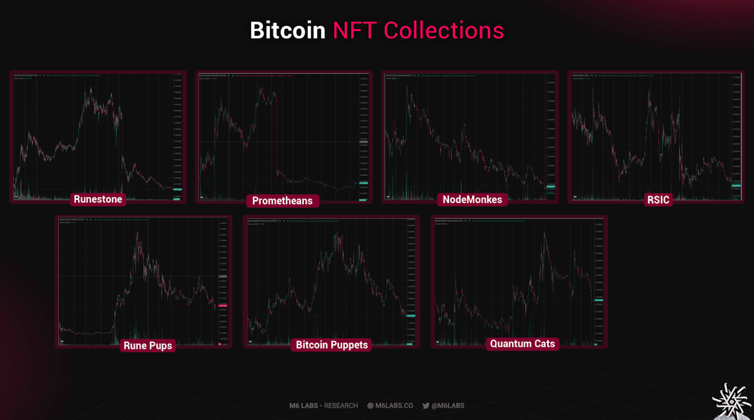 Top left to right: NodeMonkes, Bitcoin Puppets. Bottom left to right: Quantum Cats, O.P.I.U.MMoreover, users holding these NFTs were rewarded with more NFTs. NFTs like Runestones, Runepups, RSIC Metaprotocol, Prometheans and others were airdropped to holders of these collections.Â