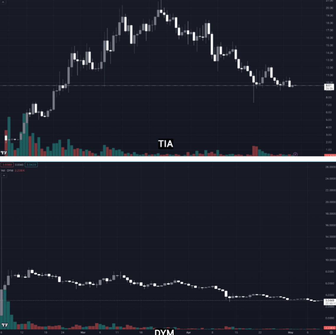 So far, TIA stakers have been or will be rewarded with multiple airdrops, among which Dymension (DYM) stands out as one of the most significant. Initially launched at around $5, it's currently trading at $3.Â