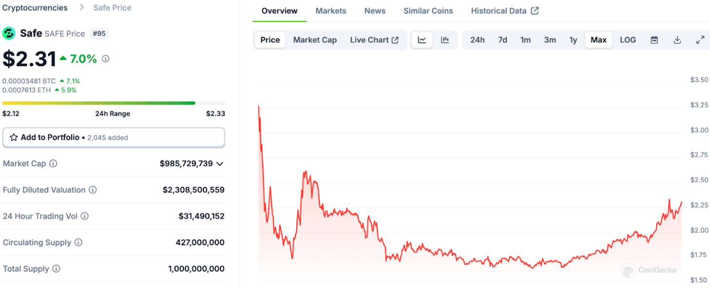 Image via CoinGeckoThe current MC is around $985M and the FDV is around $2.3B. The FDV: MC ratio is around 2.325. That’s not necessarily ideal, but it is still not out of control. We know from smart money analysis that the number of smart money addresses holding SAFE has jumped significantly.