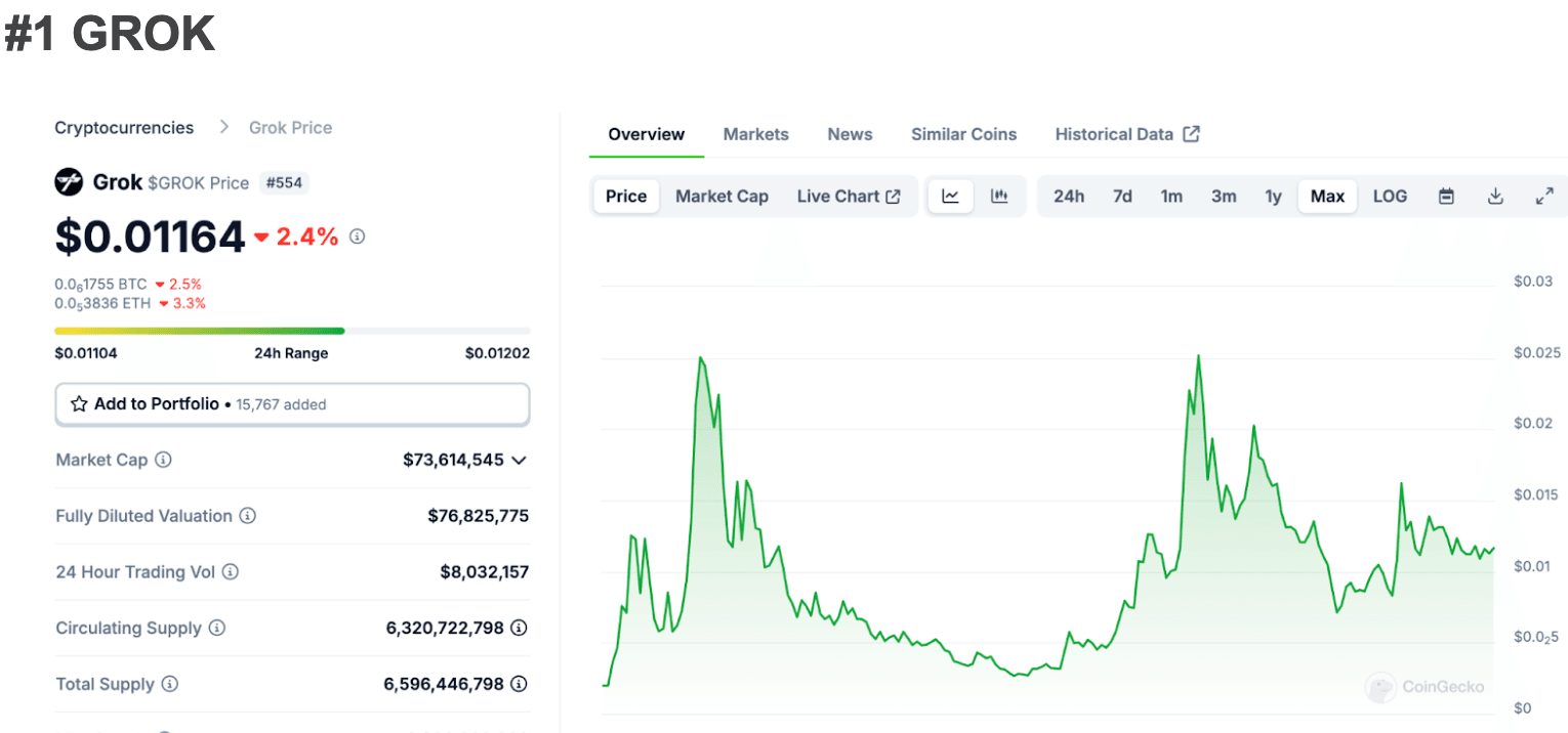 This metric underscores the appeal of GROK and similar assets, reflecting the strategic preferences of savvy investors. GROK is currently trading ~60% below its ATH, so upwards growth potential is definitely there.