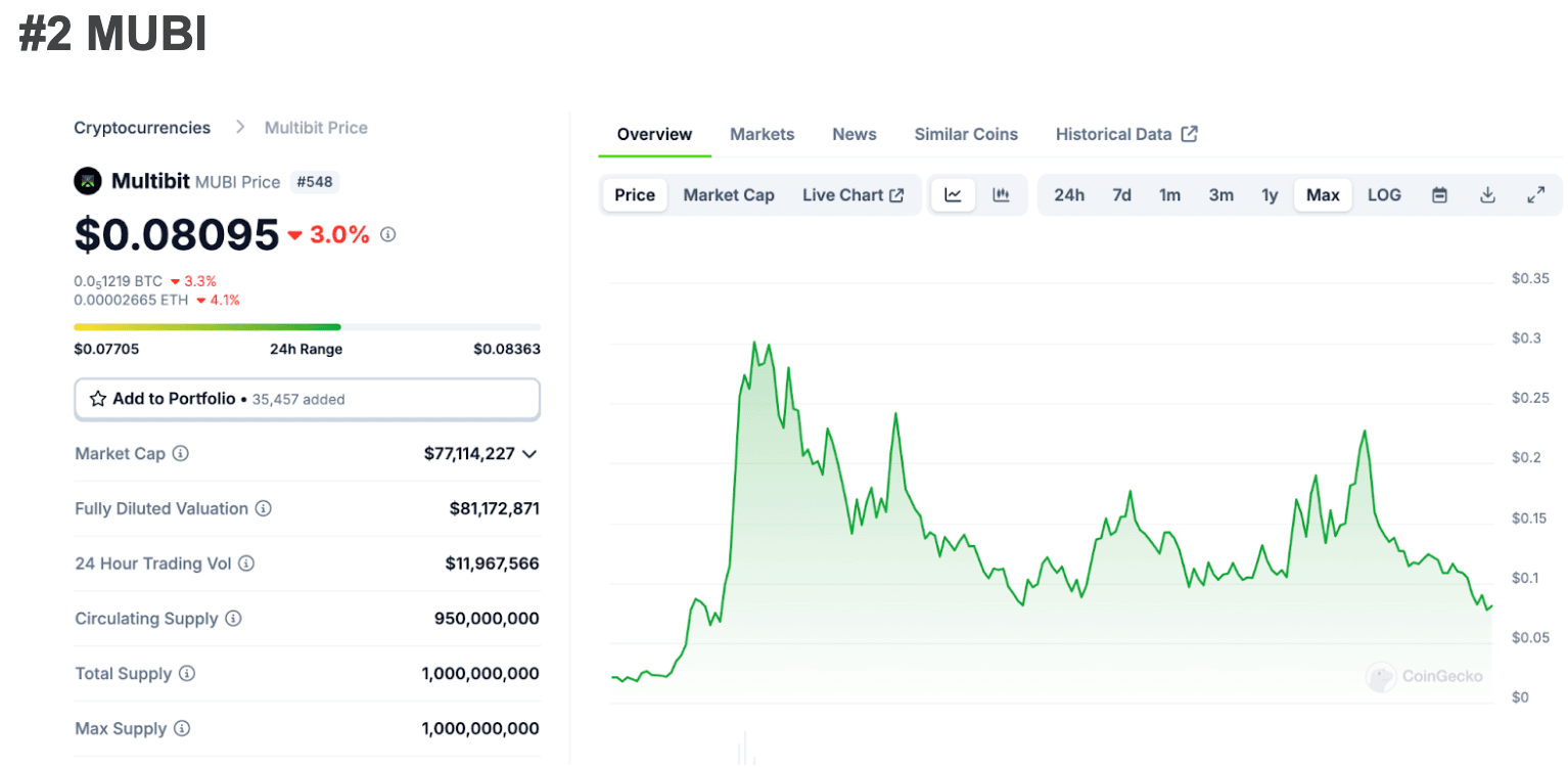 Another one with a near 1:1 FDV:MC ratio. It is interesting to see that MUBI is getting so much love. They are definitely capitalizing on the BRC20 hype. The MultiBit developers are expanding EVM compatibility for their EVM to EVM bridge, now live on Ethereum, BNB Chain, and BounceBit, to support both BRC20 and Rune assets.