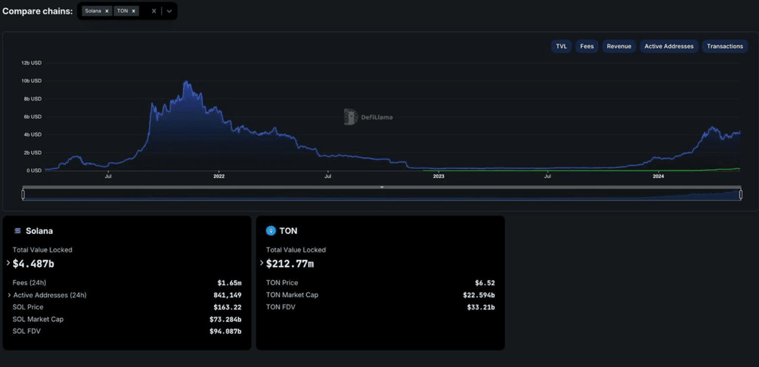 Here is a DeFi TVL comparison of both Toncoin and Solana.