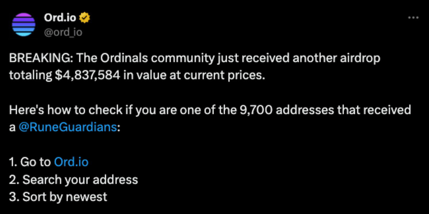- Holding top Ordinals collection on Bitcoin offers rewards, with Rune Guardians being the latest collection to be airdropped to holders. Previous airdrops included RSIC, which had significant value at its peak. Individuals holding collections like NodeMonkes, Bitcoin Puppets, Bitmaps, and Bitcoin Frogs have the potential to receive such rewards.