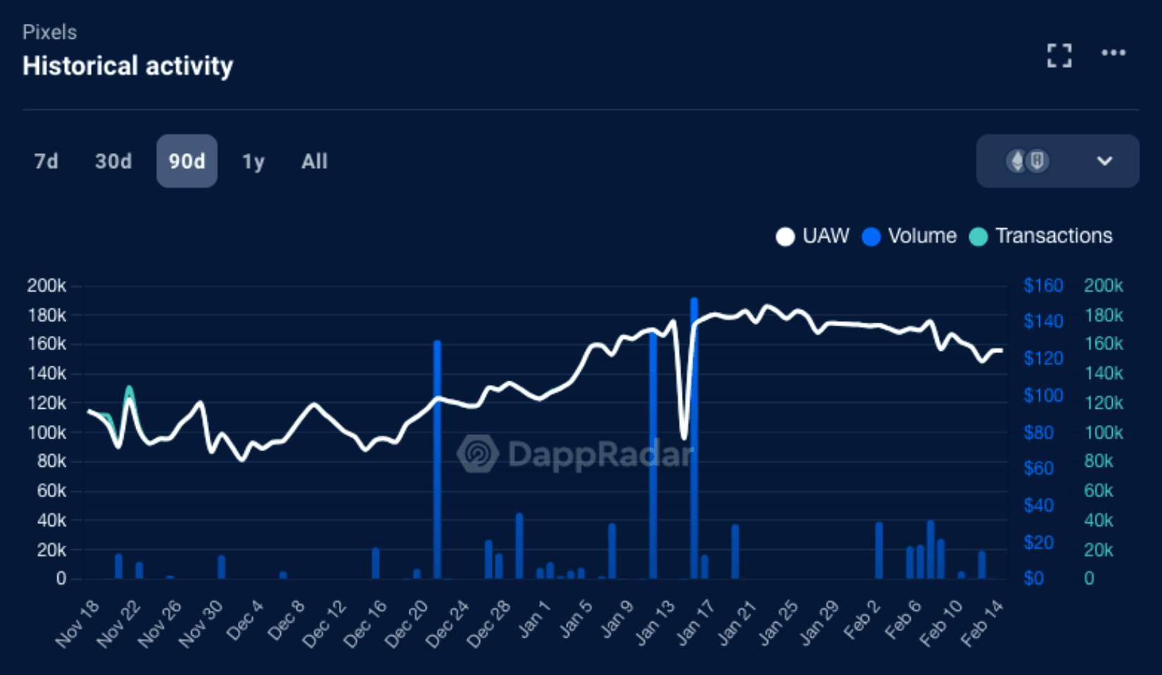 Pixels is poised to become a blockbuster in the blockchain gaming arena, with its player base steadily increasing. Source: DappRadar.