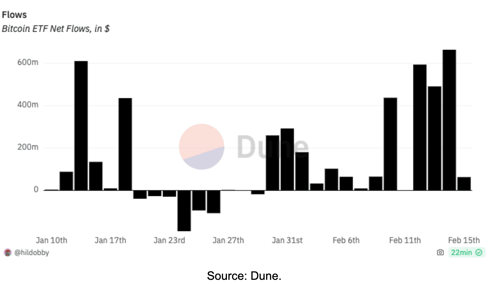 On February 14th, the highest amount of ETF inflows was recorded, surpassing $600 million.