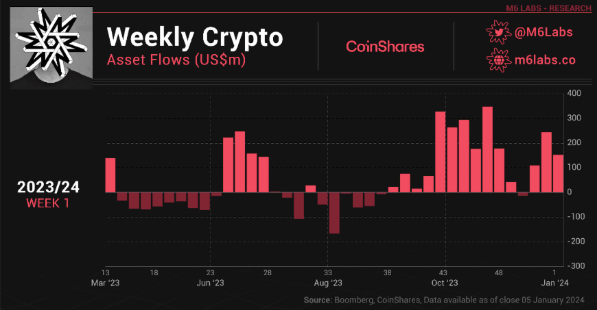 - Digital asset products received $151M in inflows in the first week of 2024.