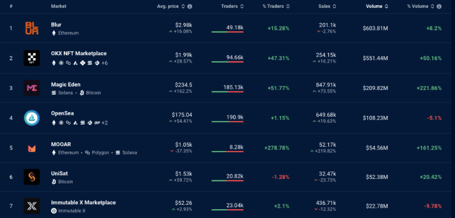 Blur continues to rank as the number one NFT marketplace. Opensea has been overtaken by rising giants Magic Eden and OKX NFT Market Place. Many believe OpenSea will drop a token this coming cycle in order to encourage user activity in an attempt to gain back market share from its competitors. OpenSea seems to have lost its first-mover advantage which made it the centre of NFTs last cycle.