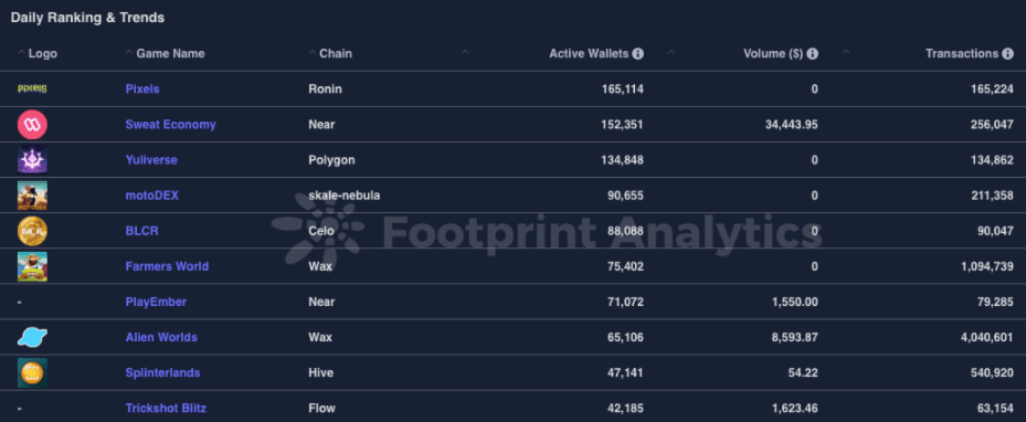 Top crypto games. Source: Footprint Analytics.Users are encouraged to keep tabs on Ronin. After overcoming challenges, including a huge exploit, Ronin has made a remarkable comeback, driven by significant advancements in the Axie Infinity gameplay experience and its role as a destination for non-Axie games.