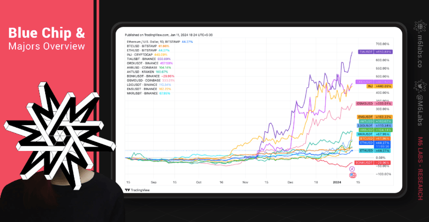 - Injective: Injective had a tremendous year wherein the price jumped by almost 3000%. Over the year, INJ jumped from $1.27 to $41.50, with the marketcap breaking past $3.5B.