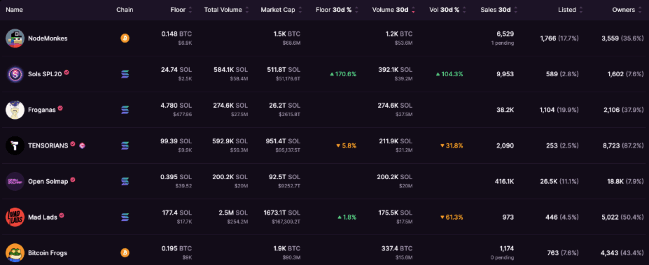 Top collections by volume over the last 30 days. Source: DappRadar. Checking in on Solana’s most popular NFT marketplace reveals that the Solana NFT ecosystem has pulled back since its highs towards the end of last year. Magic Eden’s pivot into the Bitcoin ecosystem has started to yield positive results with some of its most important collections being from the Bitcoin ecosystem. Take note that NodeMokes currently holds the top spot for most volume, overtaking native Solana collections on the platform.