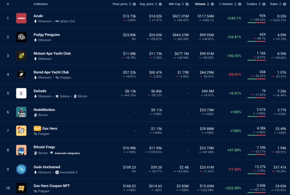 Top 7 marketplaces over the last 30 days. Source: DappRadar.Traditional blue-chip NFT collections continue to dominate volume with newer collections such as Mad Lads and others rotating in and out of the top 10. Azuki has seen an impressive performance over the last 30 days, seeing an increase of nearly 250%. Pudgy Penguins has solidified itself as a mainstay of the top five through clever marketing and continuous project developments.