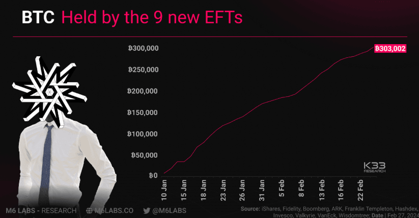 - The newly launched nine U.S. spot bitcoin ETFs have collectively amassed over 300K BTC in assets under management in less than two months since their inception.