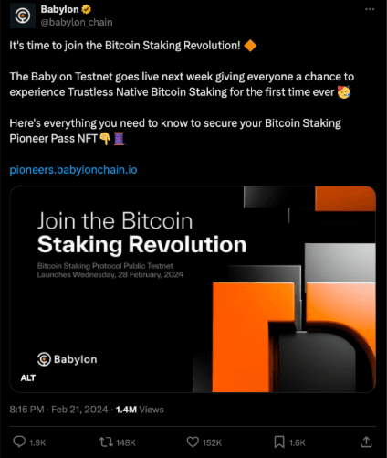 - Participation in the Babylon Testnet not only provides firsthand experience but also offers the chance to secure the coveted Bitcoin Staking Pioneer Pass NFT, granting early access to this innovative staking solution.