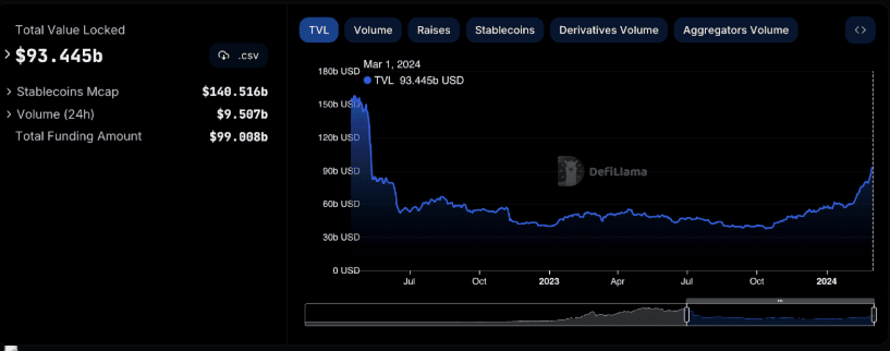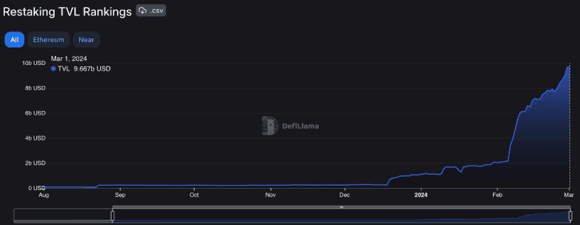 As per DeFiLlama, the TVL in DeFi has jumped from $56.58B to $93.45B – almost doubling in valuation. Specifically regarding Restaking, the overall TVL has jumped from $1.1B to $9.667B.