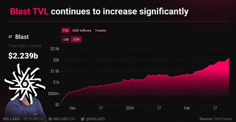 Blast’s mainnet launched on the 29th of Feb, unlocking a staggering $2B in funds, encompassing both Ether and stablecoins.