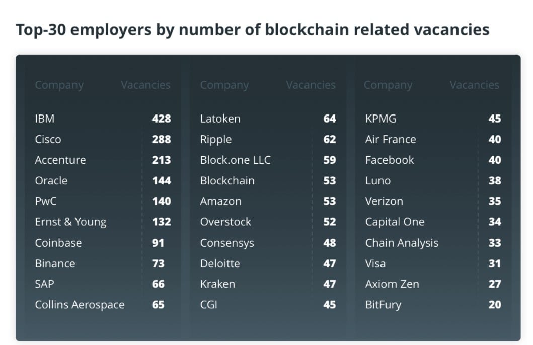Top 30 Employers with Blockchain Related Vacancies Image via cointelegraph How to Get a Blockchain Career