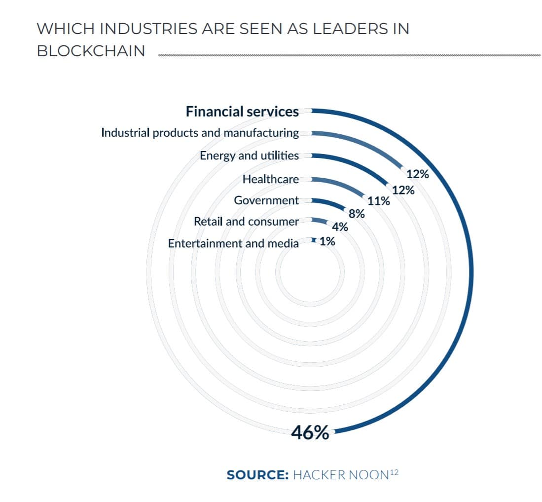 Industries That are Leading in Blockchain Adoption Image via The Blockchain Academy Blockchain’s use cases, especially in the finance industry has been noticed by the biggest players in the space. Companies such as J.P Morgan and Wells Fargo are hiring staff with experience in Blockchain technology with recent Bloomberg and Philadelphia Inquirer articles stating that firms on Wall Street are offering to pay on average, 50% higher wages to employees that have crypto knowledge.