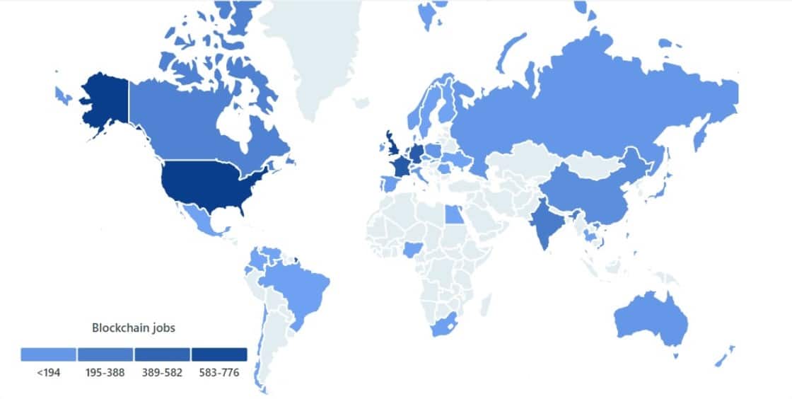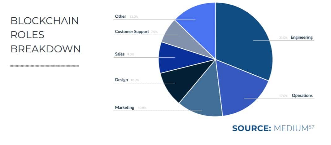 Blockchain Roles Breakdown Image via The Blockchain Academy With non-traditional Blockchain companies hiring for Blockchain positions, and many positions allowing for employees to work remotely, this has opened up positions globally, with most jobs currently available in the United States.