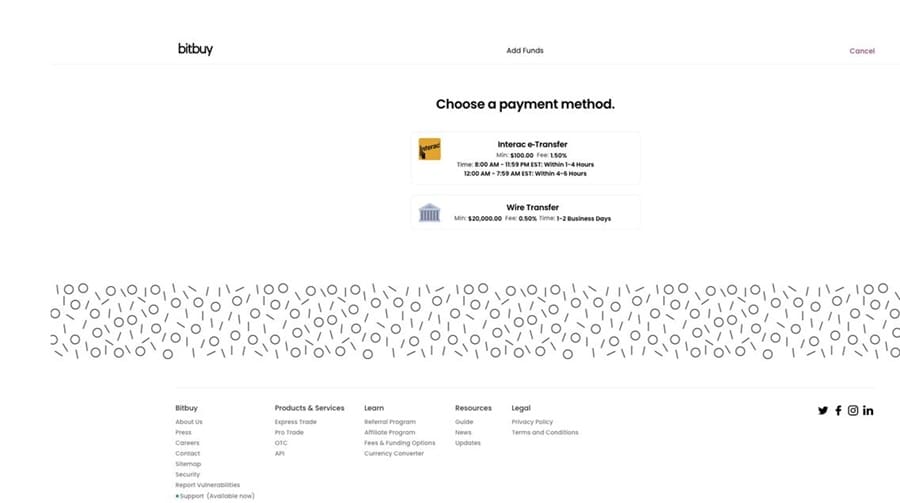 For fiat transfers in CAD there are two options: Interac e-transfer and bank transfer. Interac transfers come with a 1.5% fee on both deposits and withdrawals, while bank transfers come with a 0.5% deposit fee and a 1.5% withdrawal fee.