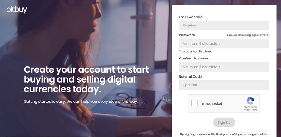 Clicking this link will take you to the Bitbuy homepage, where you’ll see the blue “Sign up to Get Started” button. Clicking it will take you to the screen shown below: