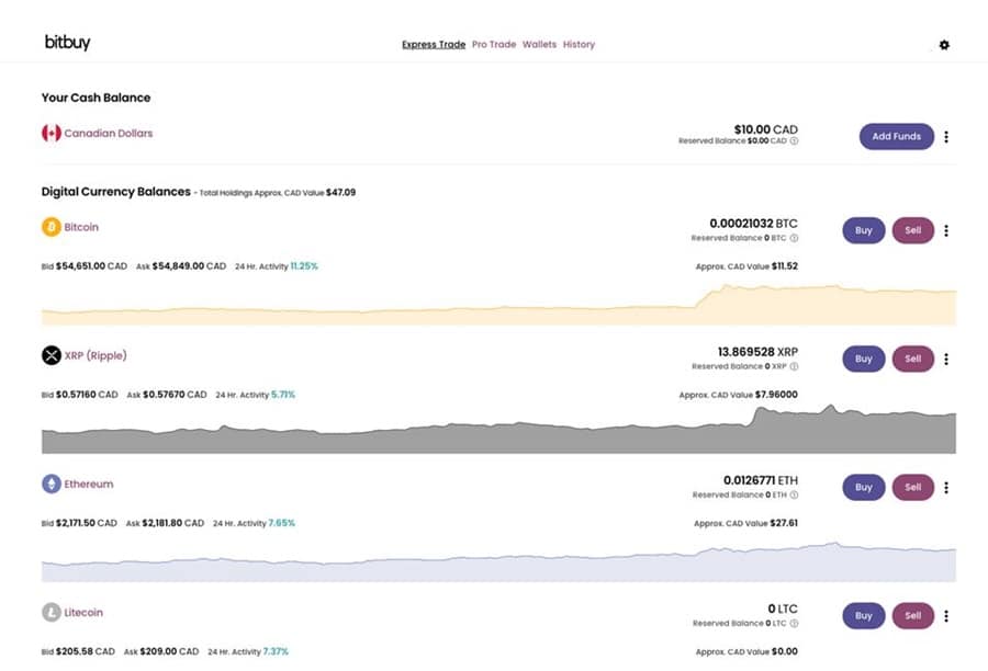 Buy and sell Bitcoin and six other popular cryptocurrencies. Using the Express Trade feature will let you buy within seconds, but the fee is a bit higher than when using the Pro Trade feature. Any coins you purchase here go to your included Bitbuy wallet.