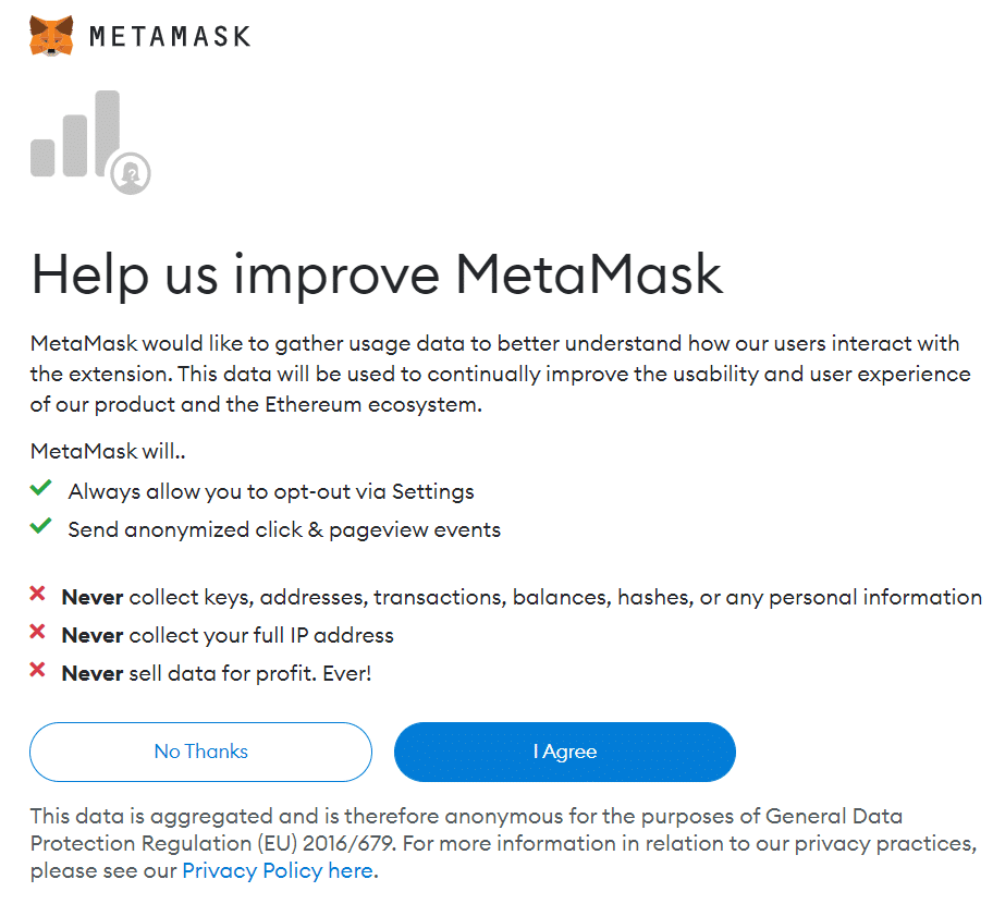 MetaMask Data Collection NotificationStep 4: Regardless of which option you choose, the next screen you will see is the MetaMask data collection permission notification. If you don’t mind the application collecting your data, go ahead and click on ‘I agree’. The data MetaMask wants to collect is anonymous clicks and pageviews. This data will be used in refining the development of the MetaMask application. However, if you ask me, I’d suggest you decline this data collection request by clicking on ‘No thanks’. It’s best for your privacy if you turn off any data tracking options.
