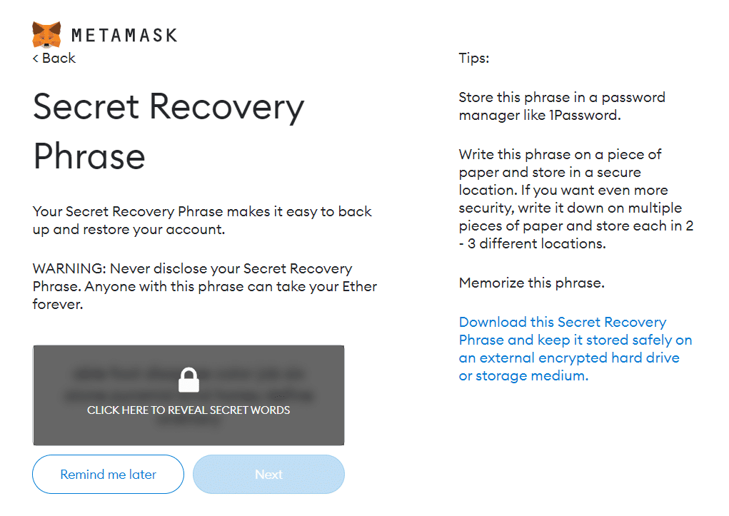 MetaMask Secret Recovery PhraseStep 6: Once you click next, the page will display a short video on secret recovery phrases. Click Next again. The page should now display the page in the image indicated above. Click on ‘Click here to reveal secret words’. You should now see a list of 12 random words in a specified sequence. Make sure you note them down with the correct spellings and proper sequence.