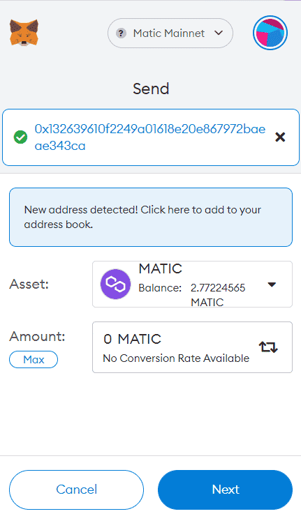 Once you’ve received the MATIC tokens in your wallet, we can start with our first transaction. This can be interacting with a smart contract on a dApp or sending some MATIC tokens to other wallet addresses that belong to your friends.