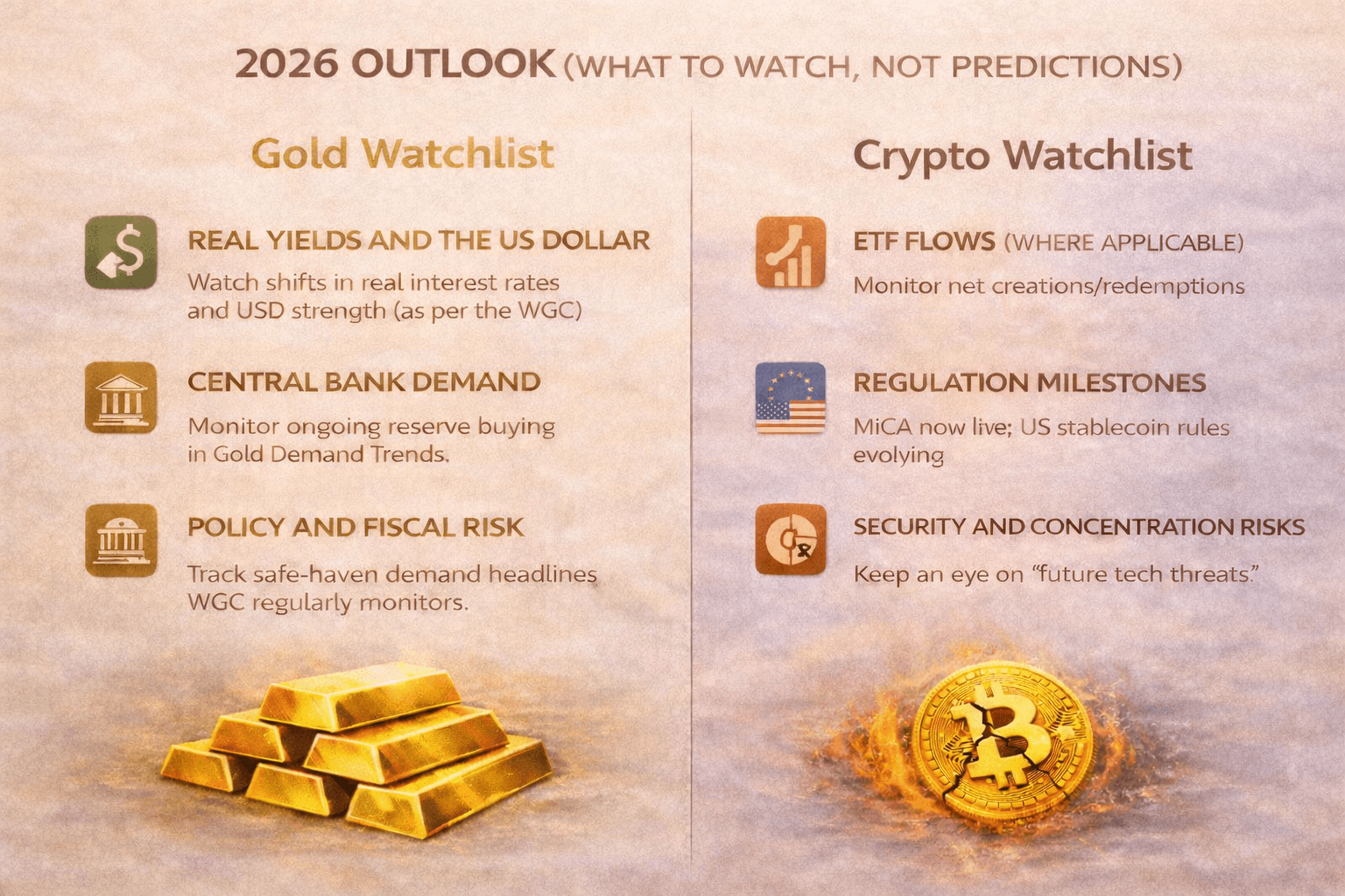 Rather than guessing prices, a more reliable approach is to track the forces that tend to move each asset. For 2026, that means watching macro conditions for gold and flows + policy + security for crypto.