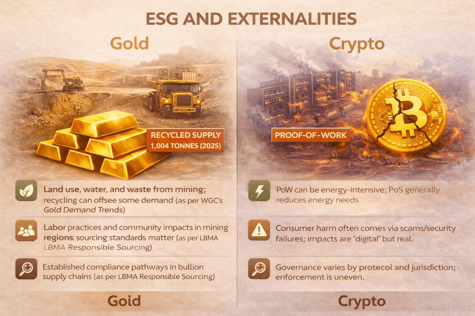 ESG is where the “gold vs crypto” debate gets less theoretical and more physical. Both systems have real-world footprints, just in different places: gold’s impact is mostly upstream (mining and supply chains), while crypto’s impact depends heavily on the consensus mechanism powering the network.