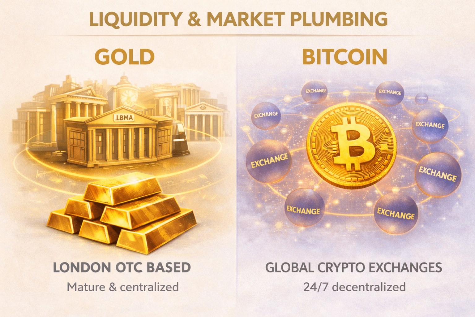 Price Charts can make Gold and Bitcoin Look Similar, but they Run on Very Different “Plumbing”Liquidity Reality Check (24/7 vs “deepest pool”)