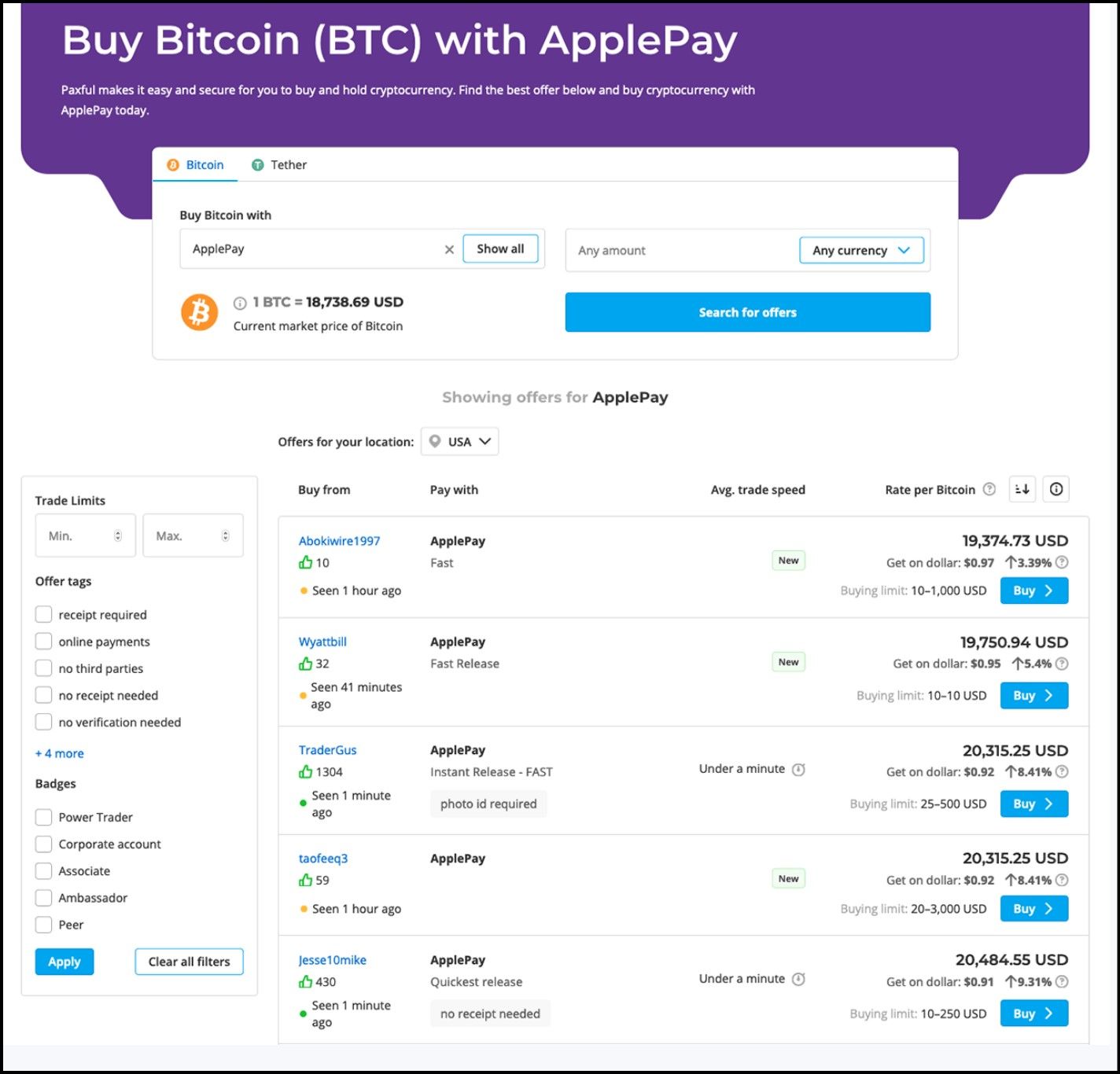 - Browse Offers: Paxful will display a list of sellers who accept Apple Pay. Review the list of offers, checking the seller’s rating, reputation, and terms of trade. Each seller may have different conditions, such as required documentation or transaction limits.