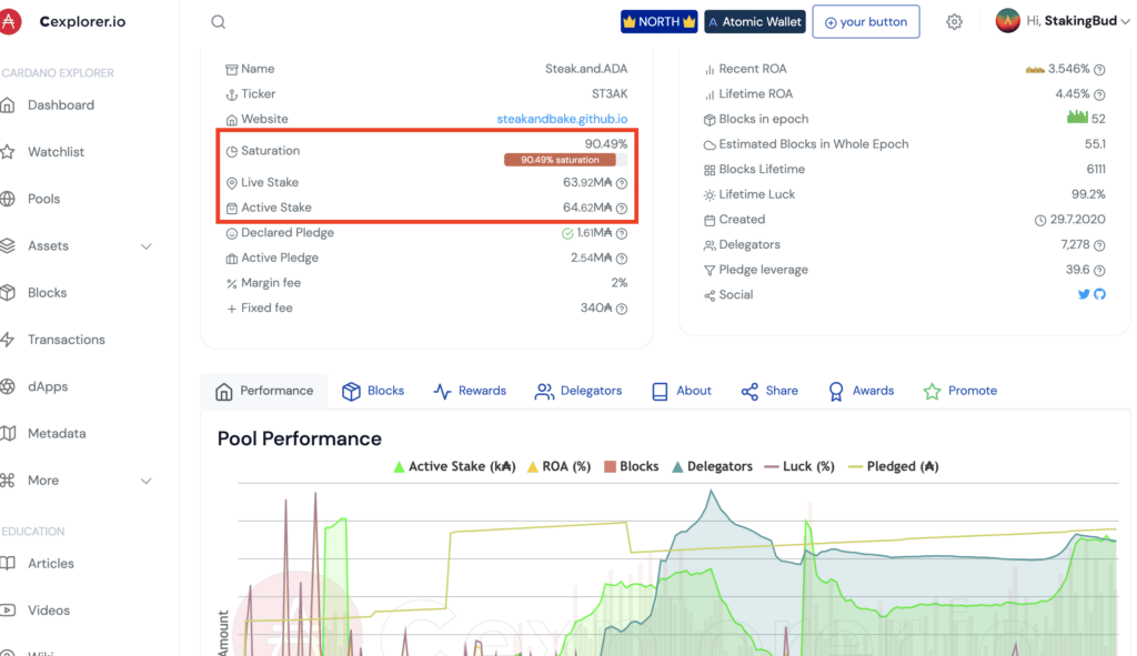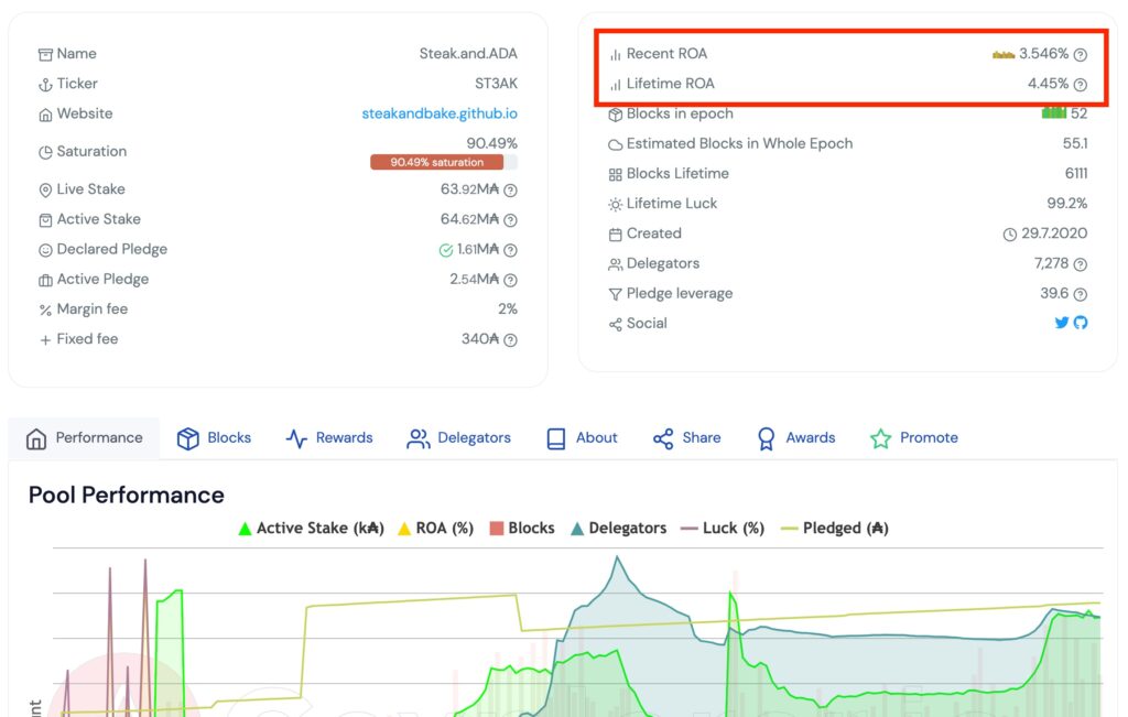 The staking figure shows how much ADA has been delegated to the pool. Pools that have a higher stake total than the network’s saturation limit results in negative effects on the rewards pool, such as lower or no ADA rewards being paid out. This is where the above-mentioned 64 million ADA limit is shown.