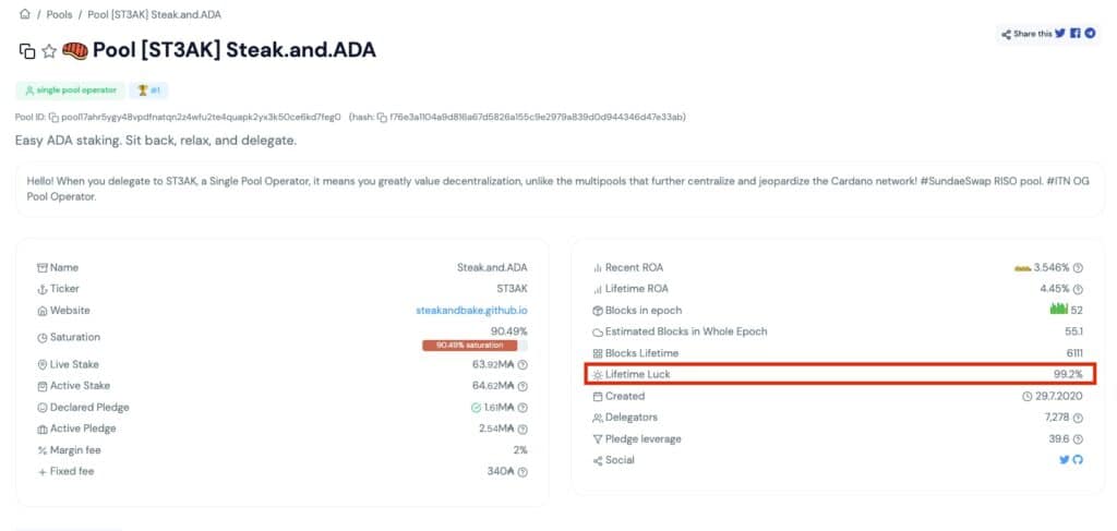 Image via adapoolsThis figure averages out over time and doesn’t have a large impact on your ADA returns. Some active ADA pool delegators will treat staking like a slot machine and often swap pools, looking to get into some that show unlucky, hoping to get in at the moment the luck has a higher chance of changing. Most stakers don’t worry about it as one of the best things about crypto staking is that it can be passive.