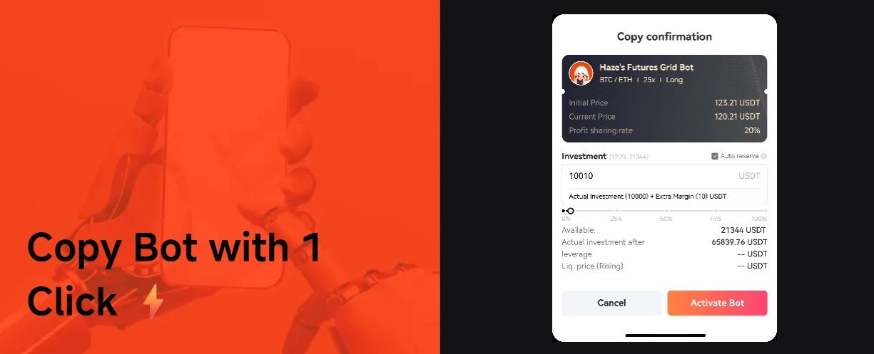 - CopyBot works differently by automatically mirroring futures grid bots created by traders you follow, launching the same setup in your account.
