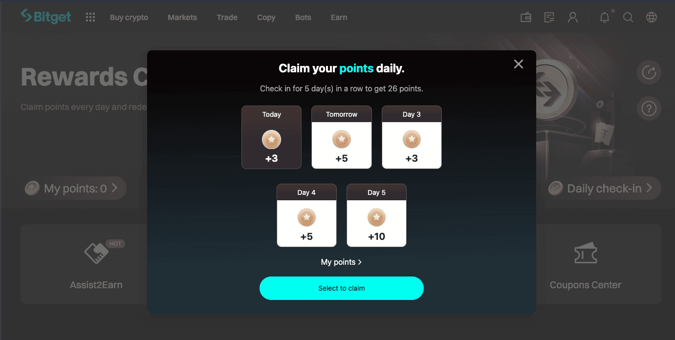Collect points by logging in daily. Image via BitgetHow to Create a Bitget Account with a Web3 Wallet