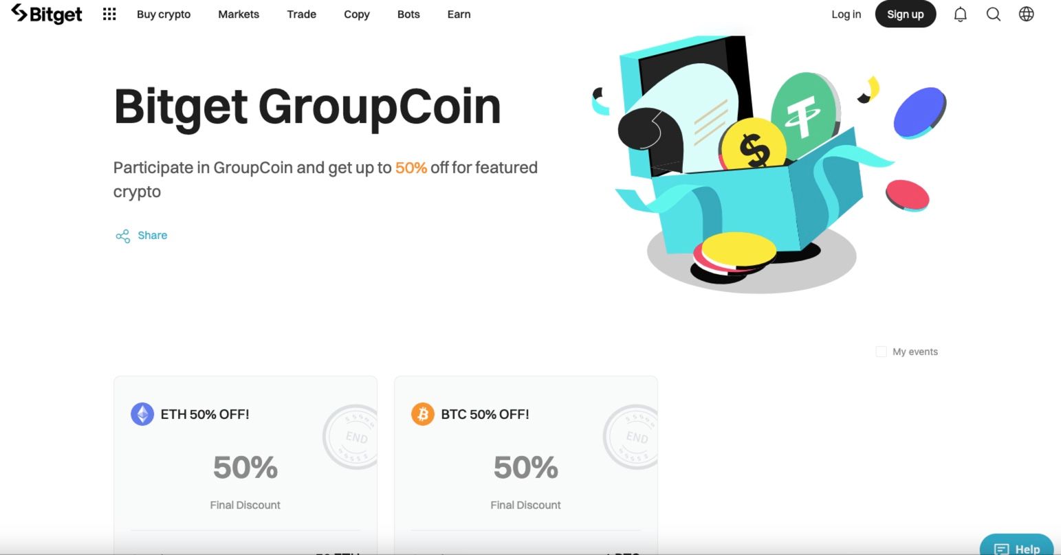 Bitget GroupCoin - Just like crowdsourcing to pool funds for bulk buy discounts, GroupCoin works in a similar fashion except that you don't know the others who are bulk-buying with you. GroupCoin allows users to pool funds together for an up to 50% discount when buying featured crypto assets.