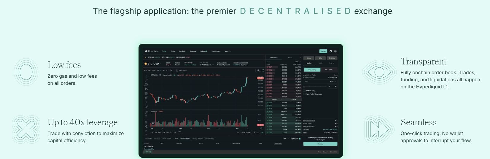 - Hyperliquid is a decentralized perpetuals exchange that features a fully on-chain order book, 50x leverage, no gas fees, and a user-friendly interface designed for both pros and beginners.