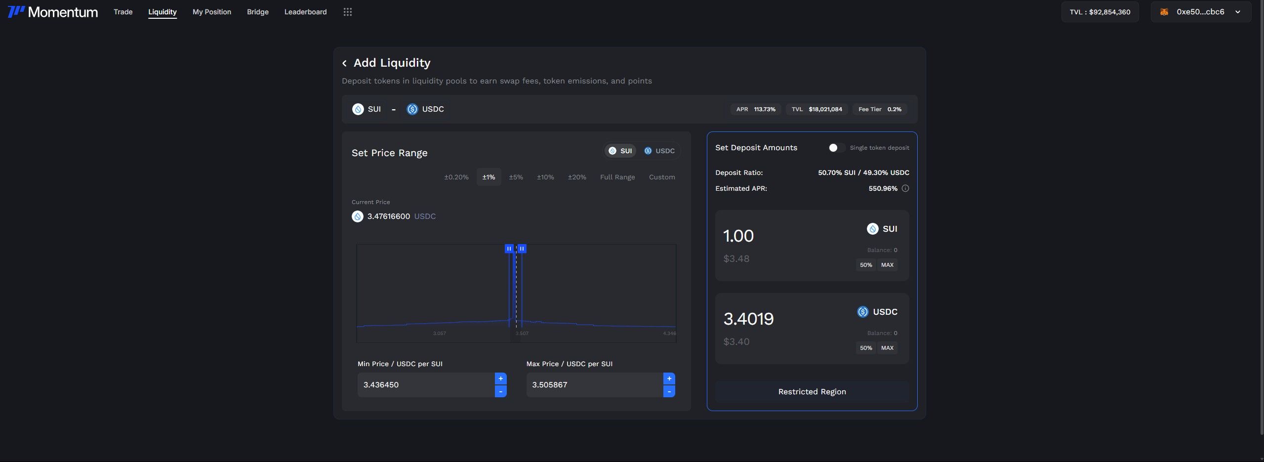 On the right panel, you’ll enter how much of each token you want to deposit. Momentum calculates the deposit ratio automatically. Unlike Uniswap V2-style AMMs, this is not always a 50-50 split. The required token ratio depends on the position of your range relative to the current price: