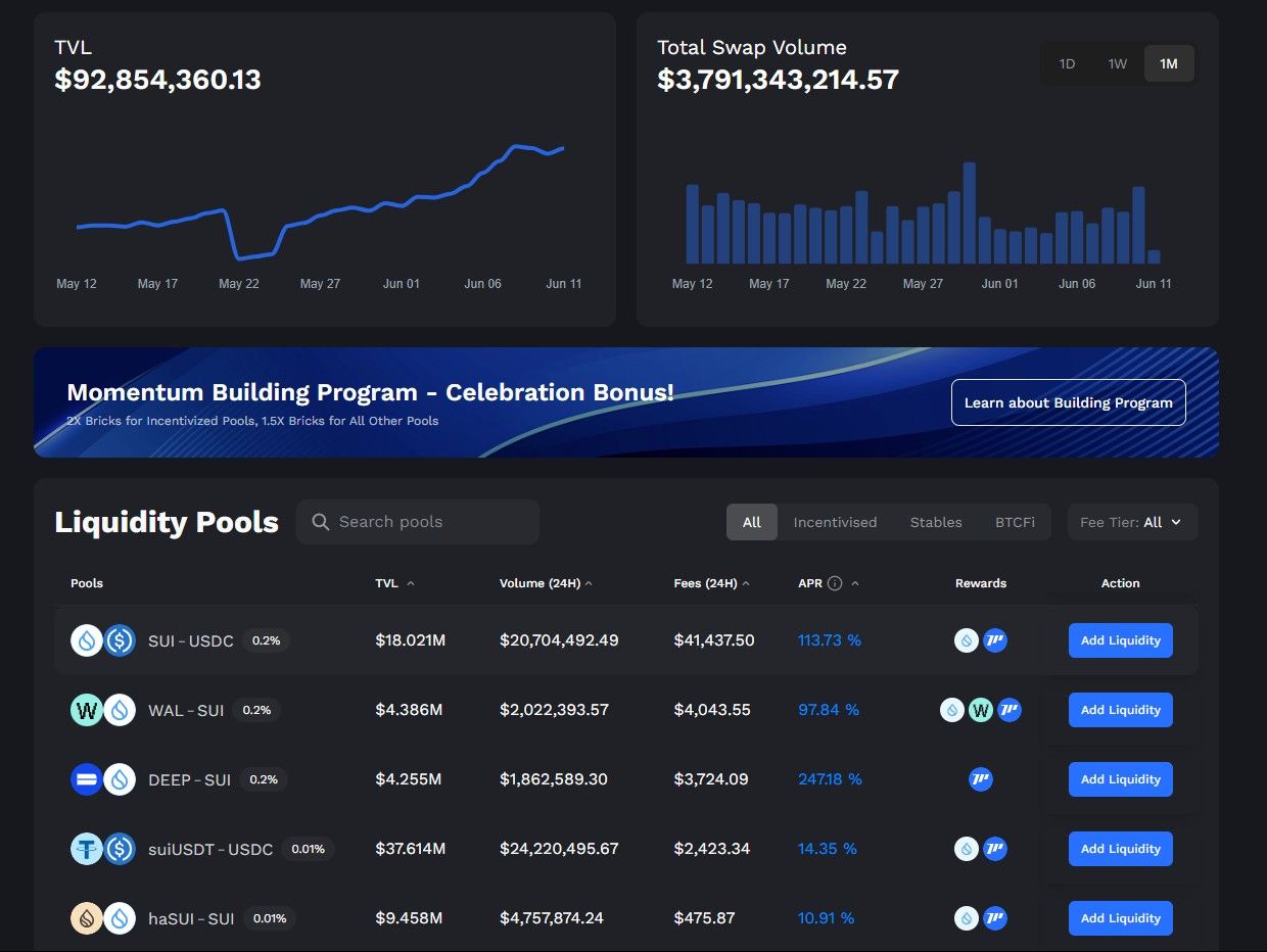 Enter Momentum Finance, one of Sui’s top concentrated‑liquidity automated market makers (CLMMs). Launched in early 2025, it represents the next generation of DEXes on the network. Momentum brings capital efficiency to liquidity and market making, including interesting features like single-sided liquidity provision.