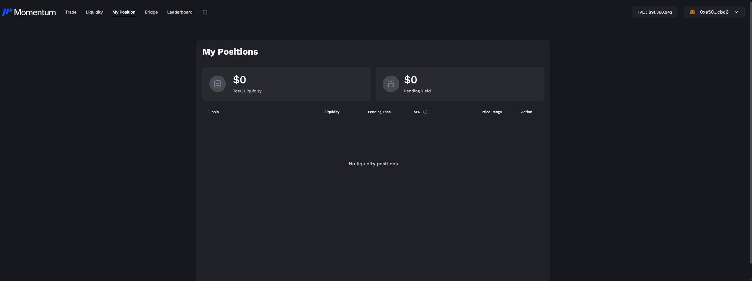 To view and manage your active liquidity positions, head to the “My Position” tab on the Momentum interface.