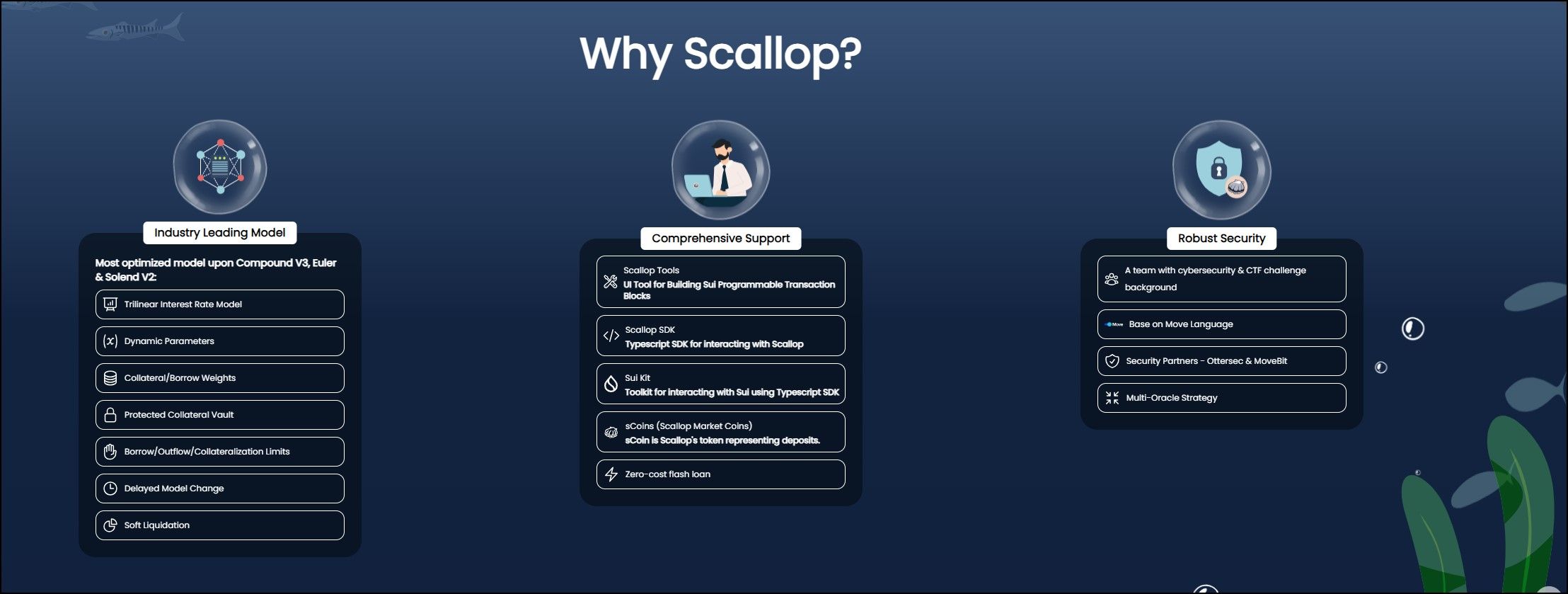 Scallop HomepageScallop is a DeFi lending protocol that optimizes the Compound V3 model to minimize risks in volatile markets. It provides comprehensive institutional-grade features, including a Scallop SDK for interaction and sCoins for zero-cost flash loans.
