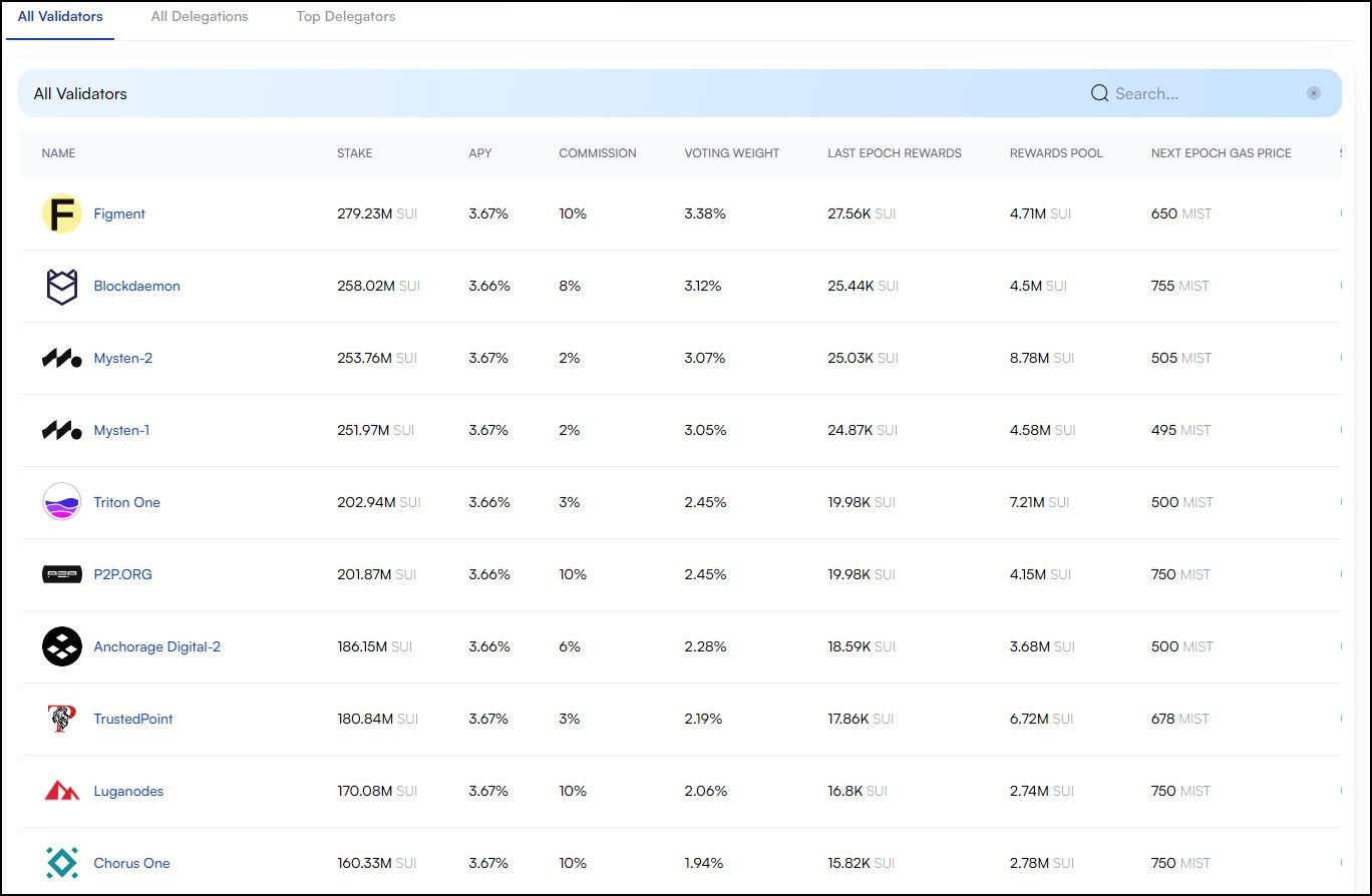 Sui Validators | Image via Sui VisionBlockchain explorers are useful tools for users to be able to verify addresses, check transaction statuses, find wallet holdings and more. We go into more detail on blockchain explorers in our Etherscan Guide.