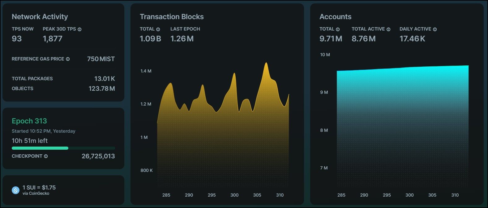 As soon as you open the Explorer, you are greeted with a snapshot of the Sui mainnet, where you can find information on Sui accounts, transaction blocks, network activity, and the prevailing gas prices.