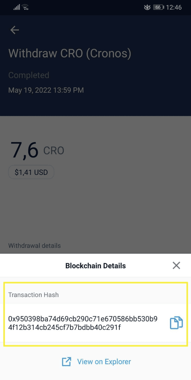 After your crypto withdrawal is processed (normally within 2-3 hours), you will receive a confirmation email. To find the transaction ID (TxHash/TxID), go to the Transaction History in your Crypto.com app, locate the transaction, and tap on the 'Withdraw to' address hyperlink. You can then copy the TxHash or view the transaction in a Blockchain Explorer.