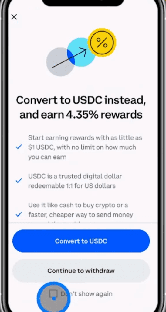 Select Transfer in Coinbase App. Image via Trufinancials Step 2: Coinbase will give you an option to convert it to USDC instead. Choose “Continue to Withdraw” if you still want to withdraw.