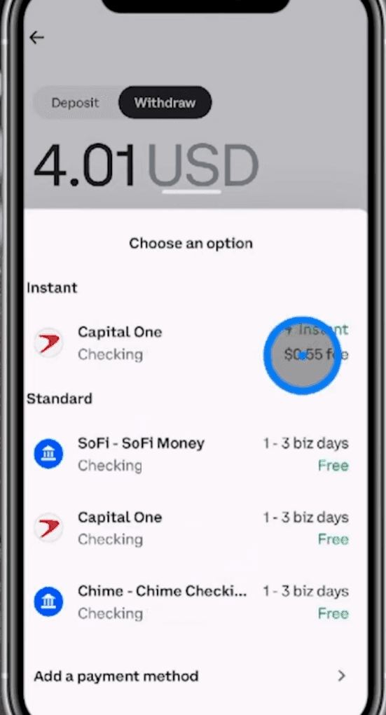 Select Transfer To Account and Check The Time. Image via TrufinancialsStep 4: Now select the type of withdrawal you want to make. Coinbase offers “Instant” and “Standard” withdrawals. Instant withdrawals come with fees.