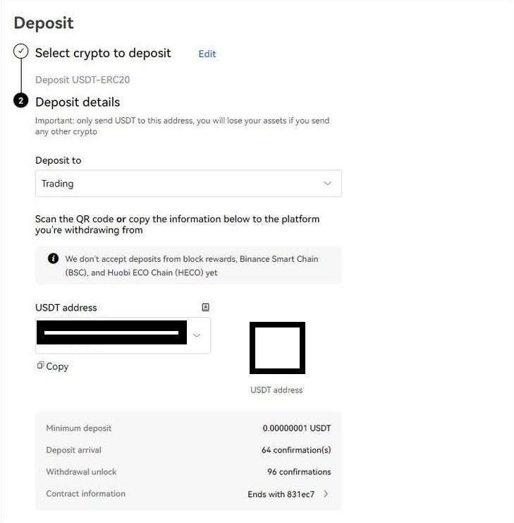 Important: Do not enter the deposit address manually and leave a chance for error. Instead, scan the QR code or copy-paste the address while sending the transaction. Moreover, please be wary of the gas fees when conducting on-chain transactions and always double-check the address for accuracy even after copy and pasting as keyboard hijacking malware can change pasted addresses to one belonging to a hacker.